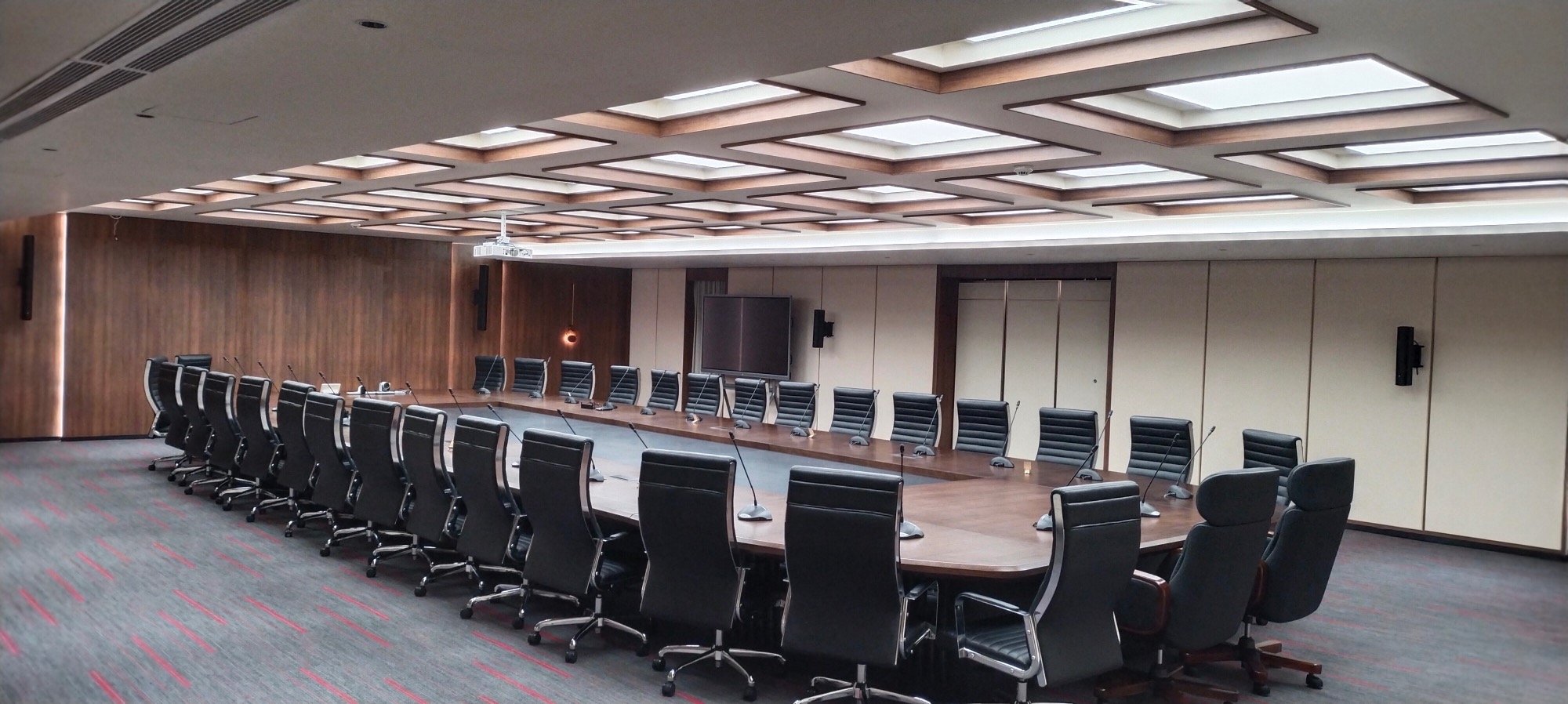 A well-appointed conference room that accommodates up to 31 participants.